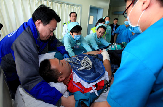王新松被抬出机舱看见这么大阵仗,试图从担架上坐起来,但身体条件不允许。海军总医院在两个小时内迅速完成了CT、超声、心电图、化验等项目。但由于全身水肿,动脉穿刺路径难以建立。